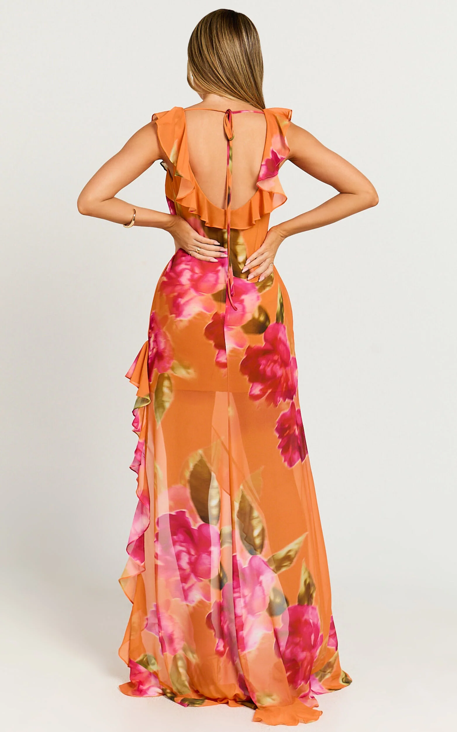 Theadore Maxi Dress - One Shoulder Asymmetric Hem Dress in Tropical Sunset