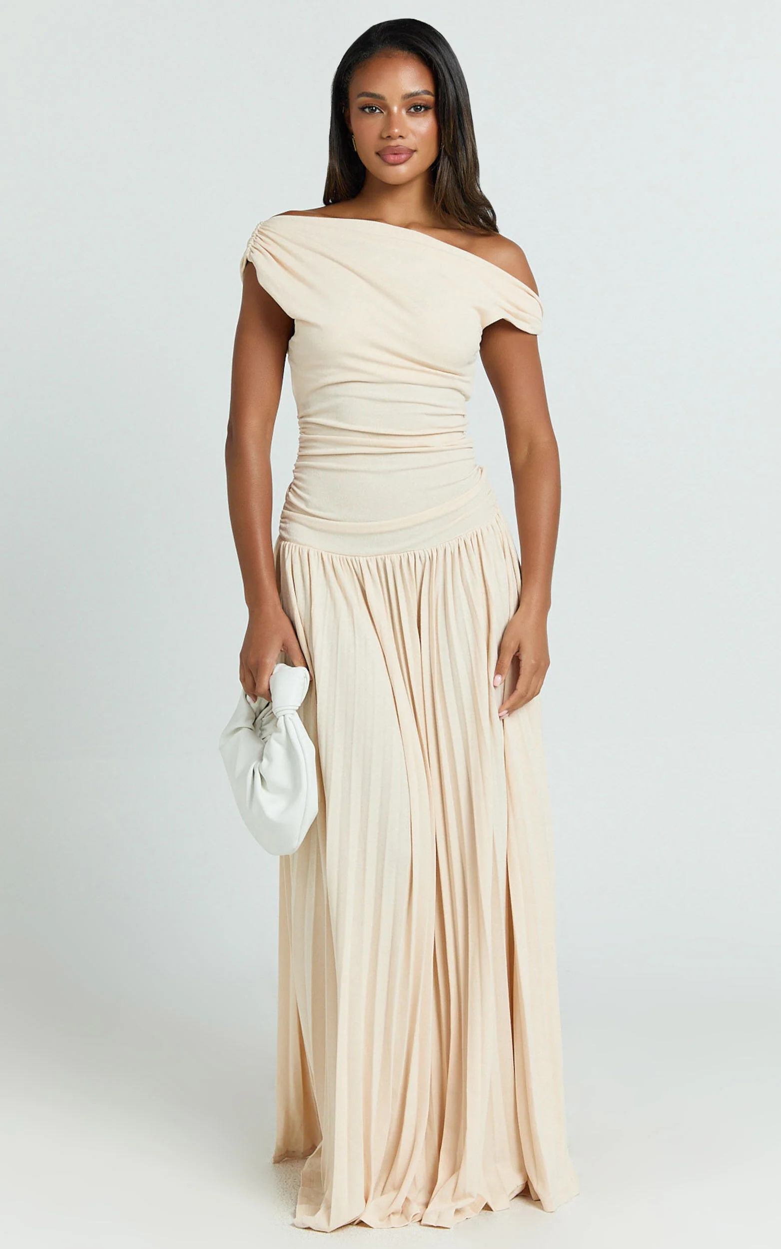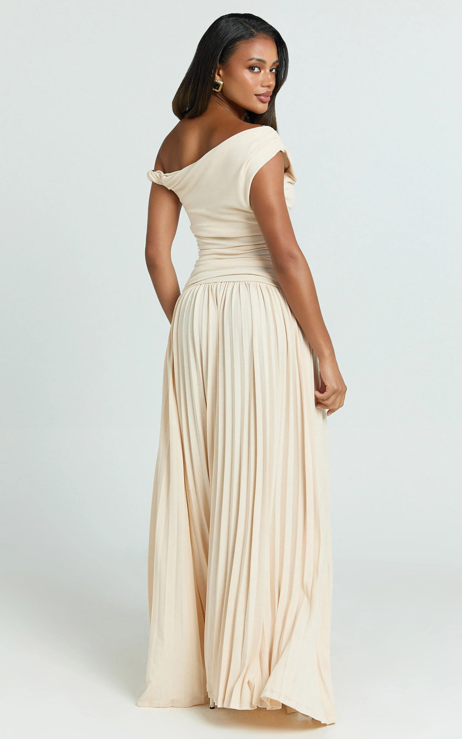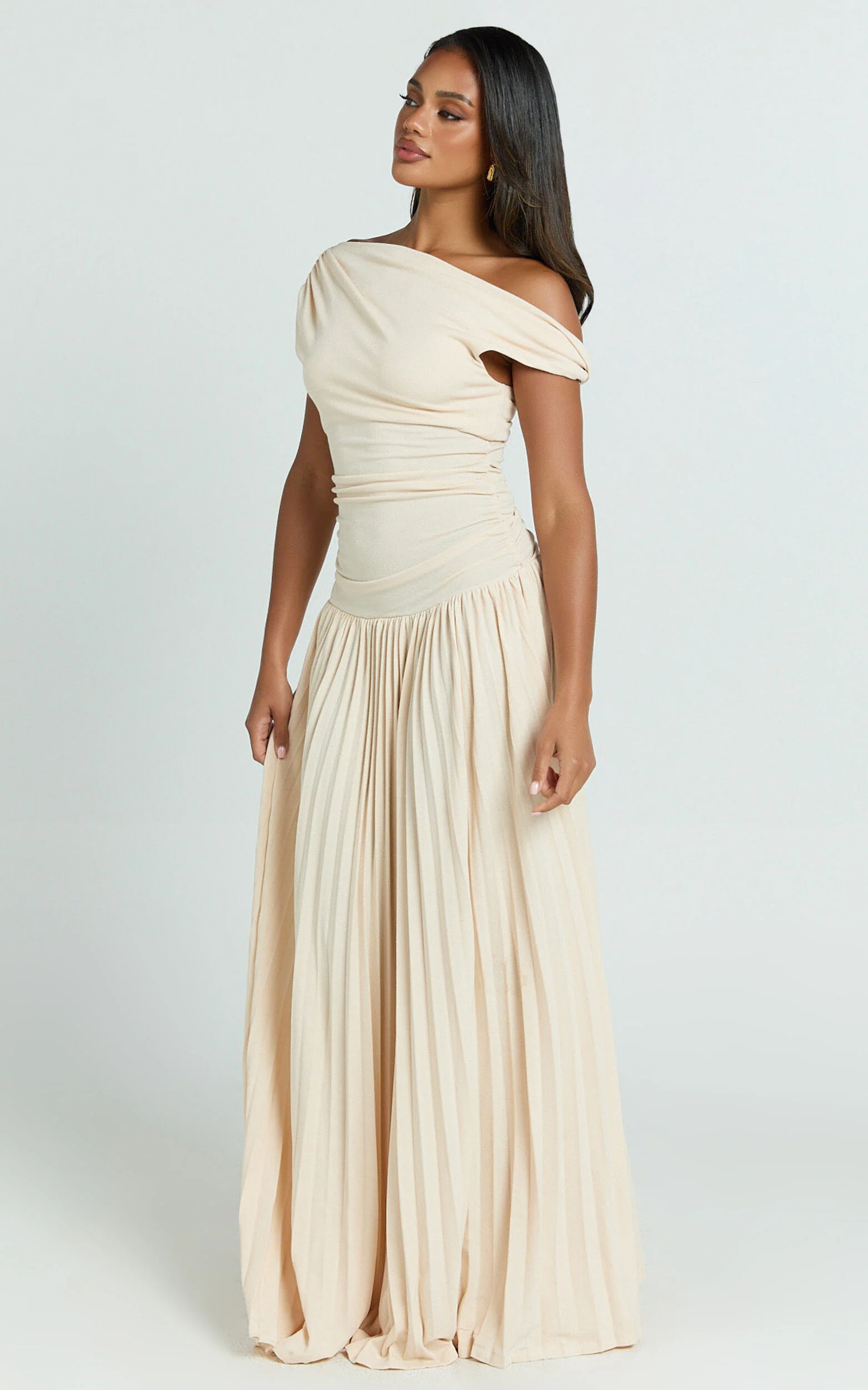 Yvonne Maxi Dress - Jersey Tip Shoulder Ruched Dress in Off White