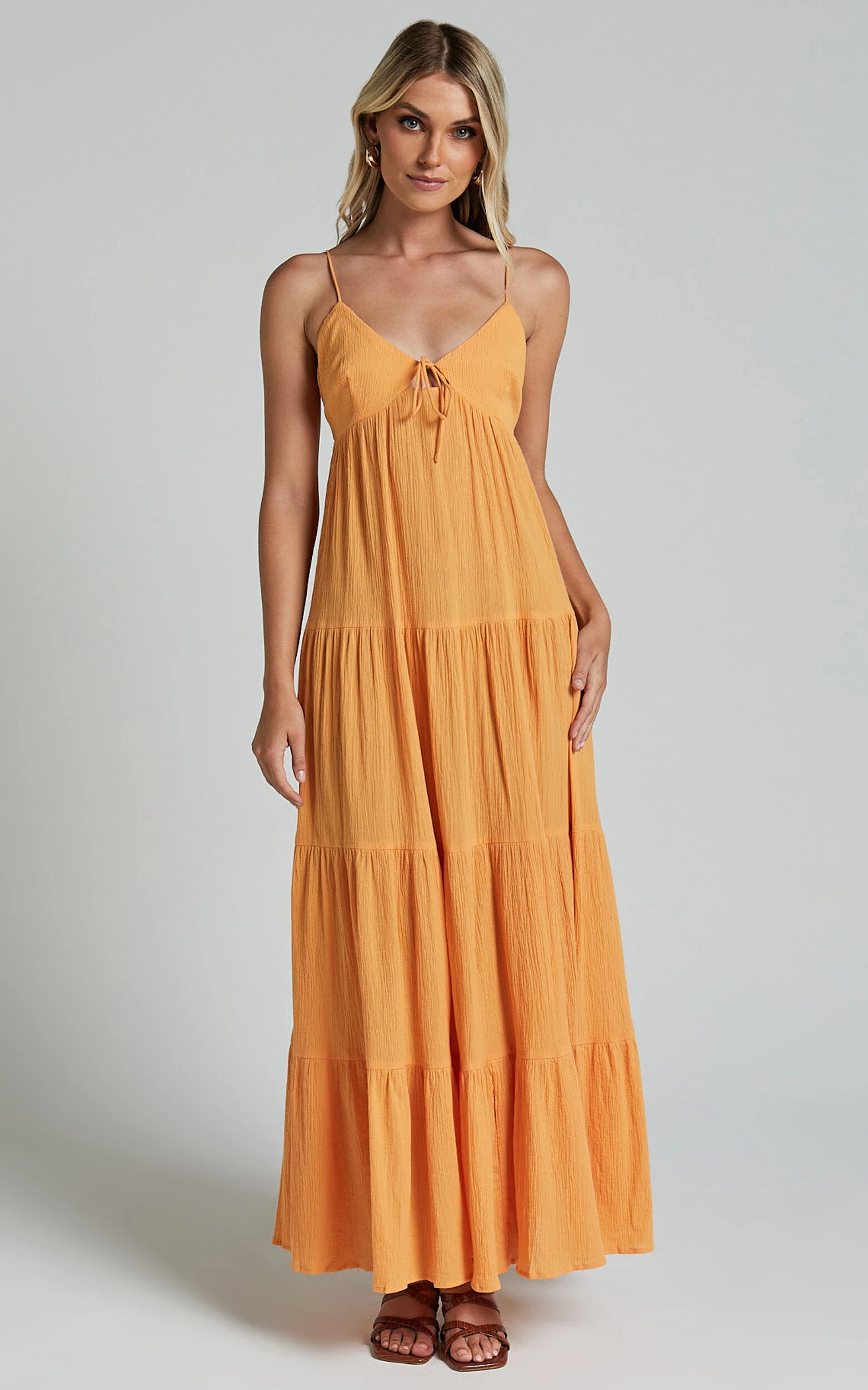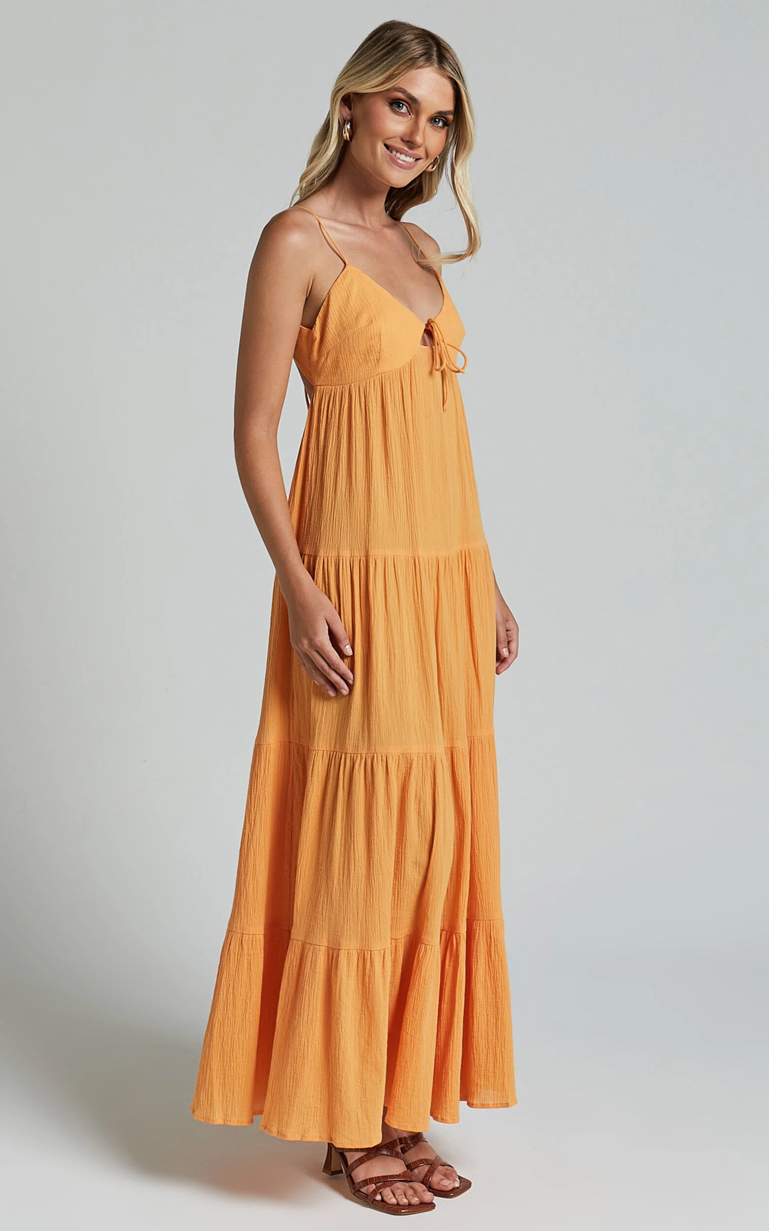 Chila Maxi Dress - Strappy Tie Front Low Back Tiered in Papaya Orange