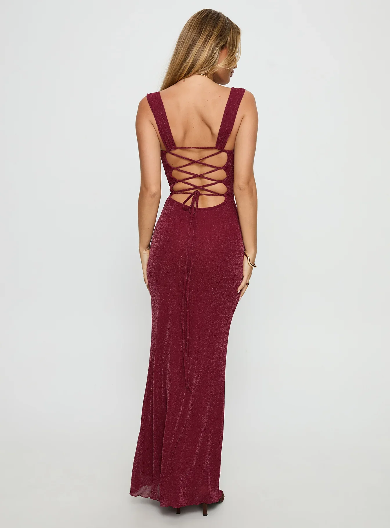 Crisanto Tie Up Ruched Maxi Dress Burgundy