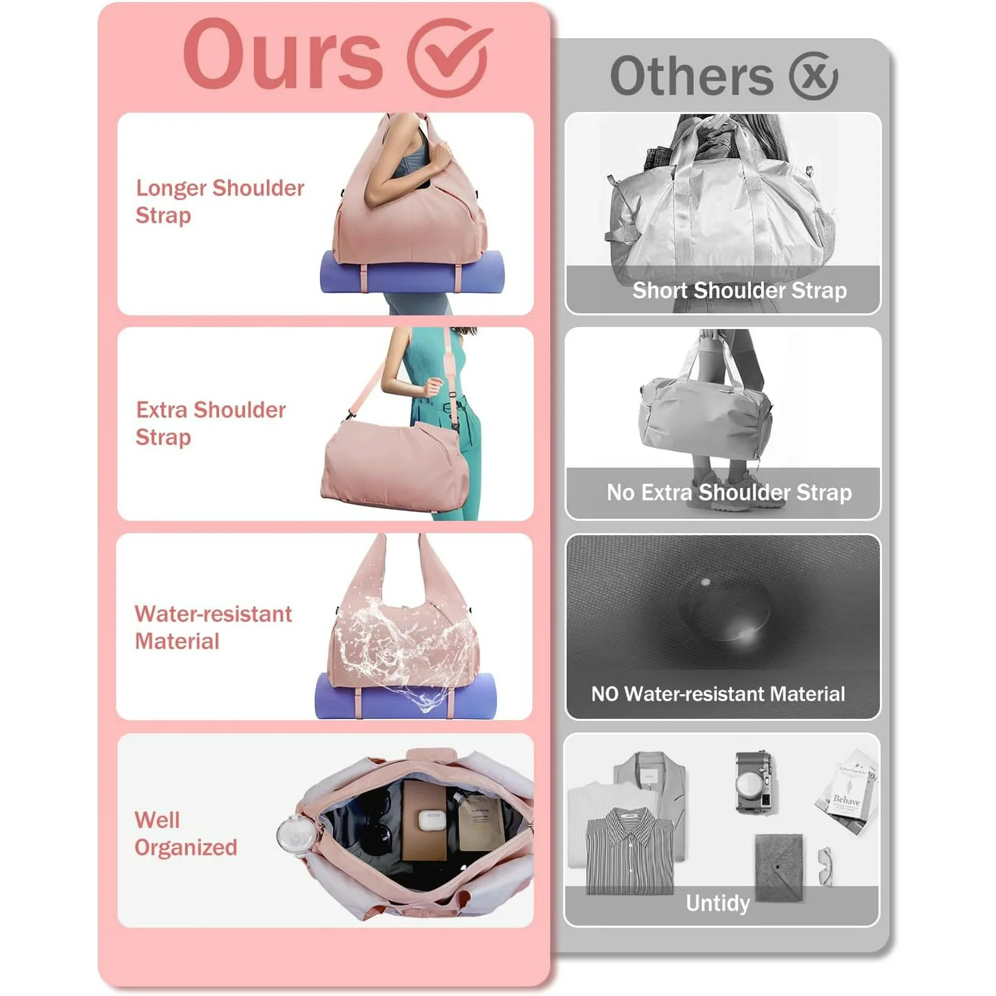 Gym Bag for Women with Shoe Compartment Yoga Mat Bag with Wet Pocket and Water Bottle Holder Weekender Bag with Shoulder Strap, Gray