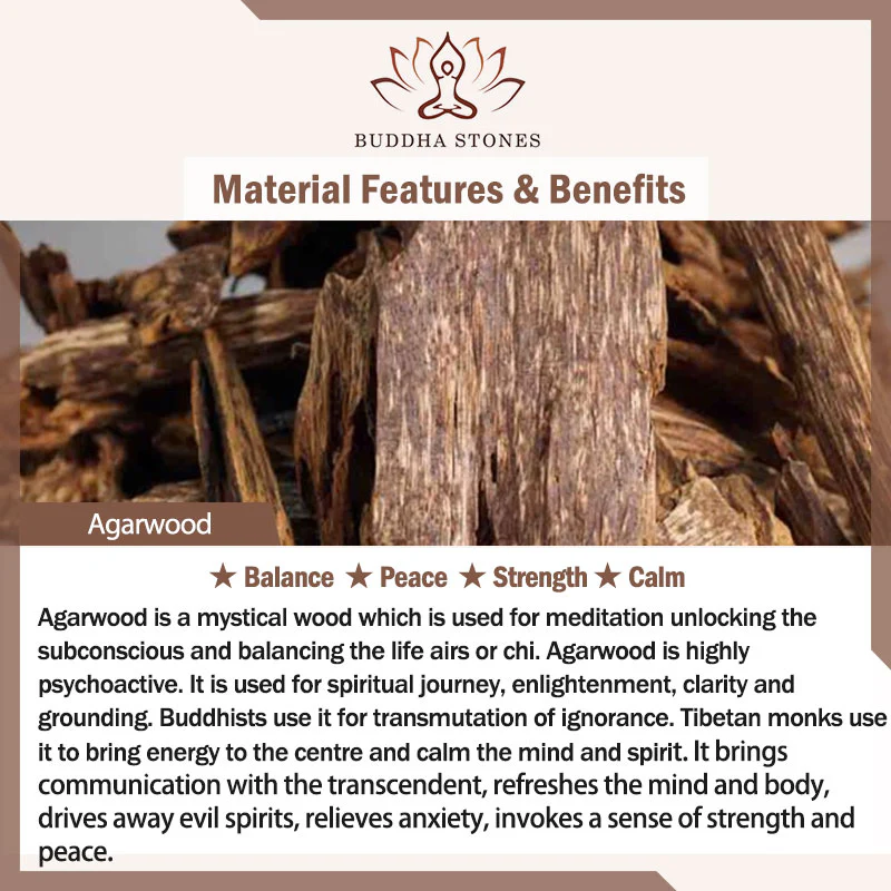 Agarwood is a mysterious wood used for meditation to unlock the subconscious and balance life energy. It is highly psychoactive, used for spiritual exploration, enlightenment, clarity, and grounding. It can help communicate with the transcendent, refresh the mind and body, drive away evil, relieve anxiety, and bring a sense of strength and peace.