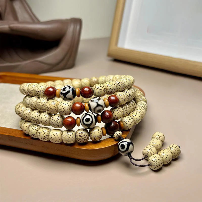 Bodhi mala bracelet combines spiritual traditions with protective symbolism. With 108 Bodhi seeds and a central Dzi bead, this bracelet is designed to repel negative energies and keep evil away. The Bodhi seeds represent enlightenment and spiritual growth, while the Dzi bead is known for its protective properties. Wearing this bracelet brings a sense of peace and offers spiritual protection.
