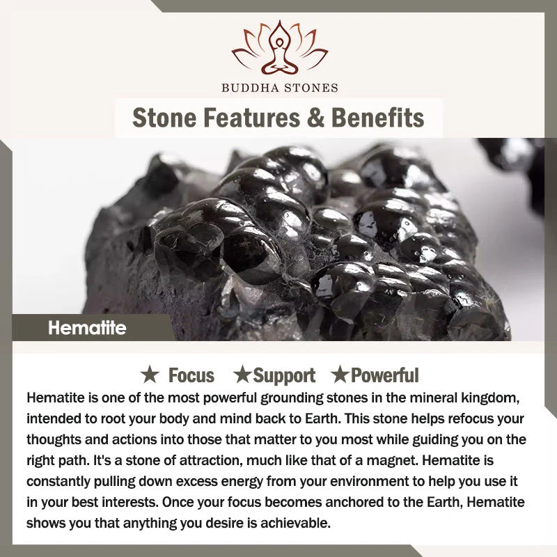 Hematite is one of the most potent grounding stones in the mineral world. It aims to connect your body and mind to the Earth. This stone helps you refocus your thoughts and actions on what matters most to you and guides you on the right way. It's like a magnet, constantly attracting excess energy from your surroundings to benefit you. Once your focus is rooted in the Earth, hematite shows you that your desires are attainable.