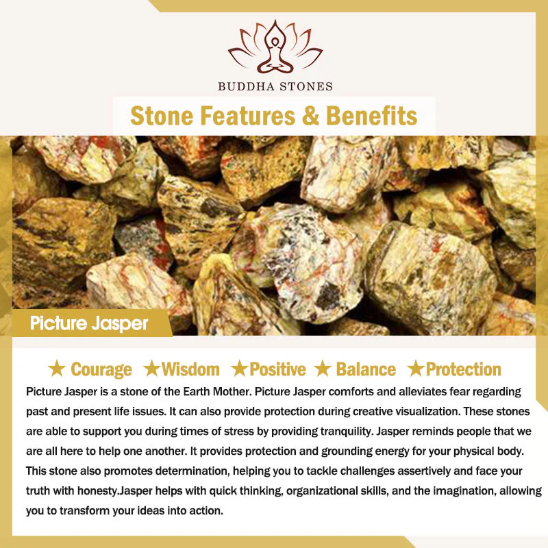 Picture Jasper is considered a stone with Earth - related qualities. It can comfort and ease fears about past and present life situations. It also offers protection during creative visualization. These stones can bring tranquility during stressful times. Picture Jasper reminds us that we should help each other. It provides protection and a grounding energy for the physical body. This stone also boosts determination, enabling you to face challenges bravely and be honest with yourself. Picture Jasper aids in quick thinking, organization, and imagination, helping you turn ideas into action.
