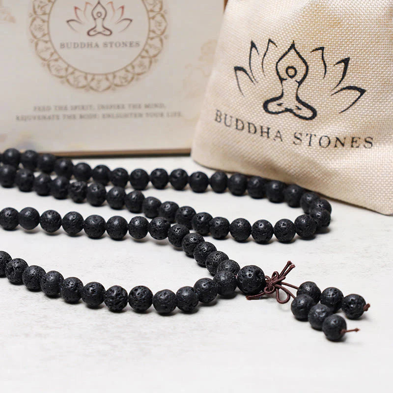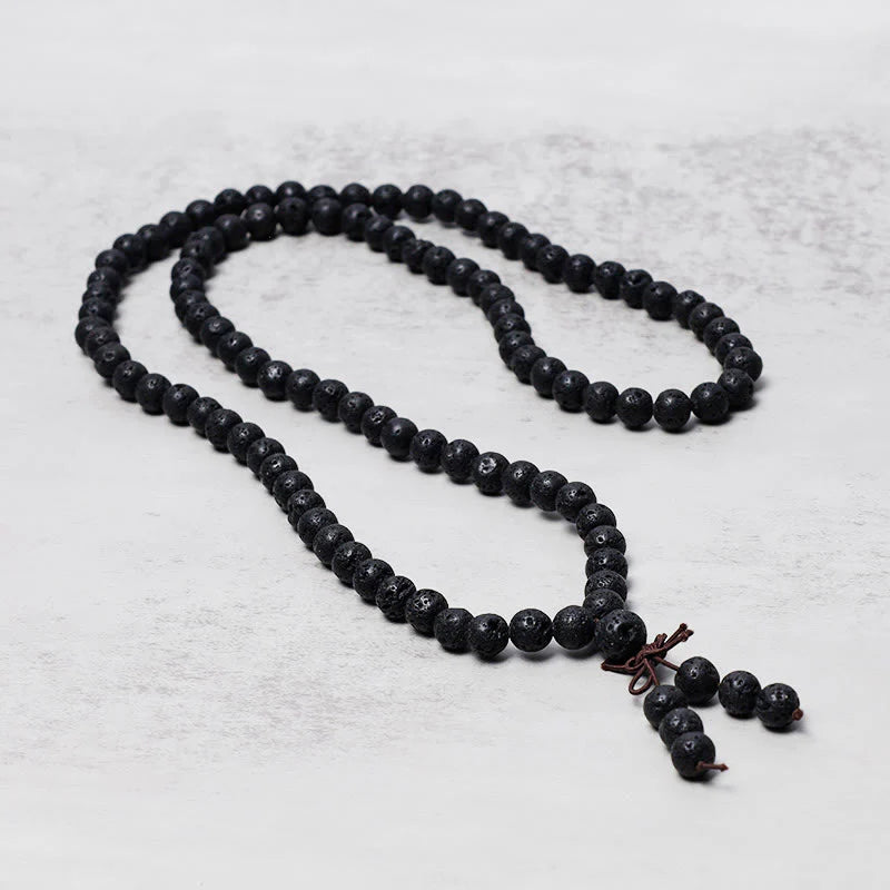 A 108 Natural Lava Rock Beads Prayer Mala Bracelet Necklace. This lava rock bracelet necklace features 108 beads and can be worn as a mala. Crafted from natural lava rock, it's excellent for meditation and spiritual activities. Enhance your style and spiritual experience with this special accessory.