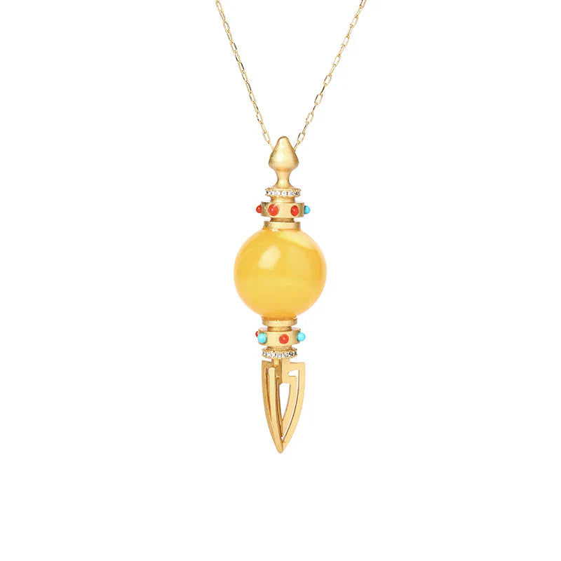 This 24K gold-plated necklace artfully combines amber and vajra. Amber is renowned for balancing emotions and alleviating anxiety, while also boosting confidence. The vajra represents spiritual strength and enlightenment. This pendant is not just jewelry; it's a symbol of resilience and spiritual energy, helping the wearer face life with a calm and enlightened mindset.