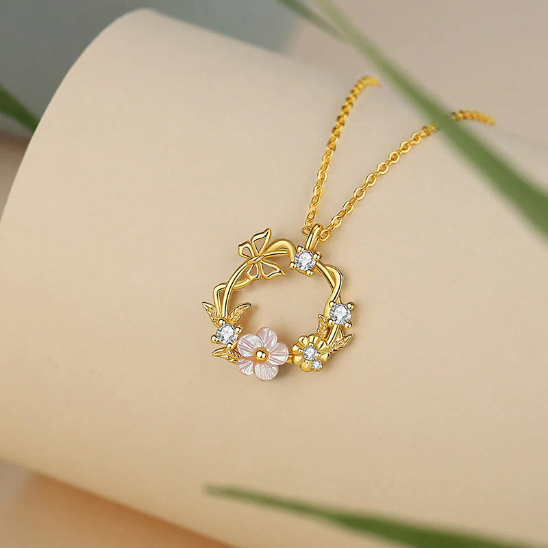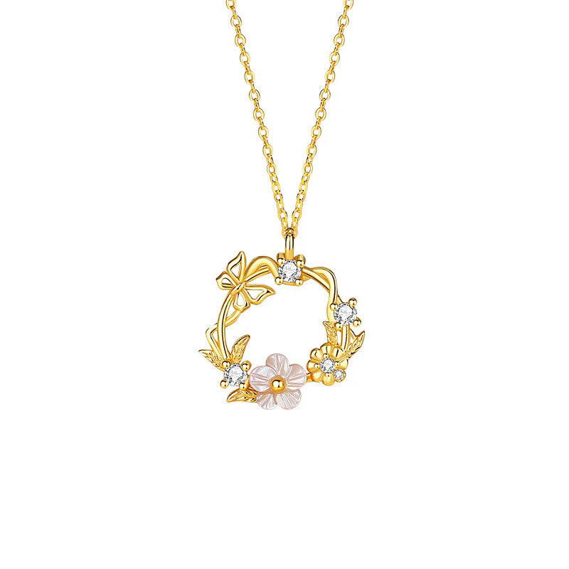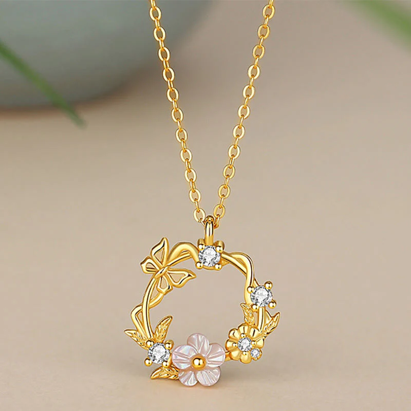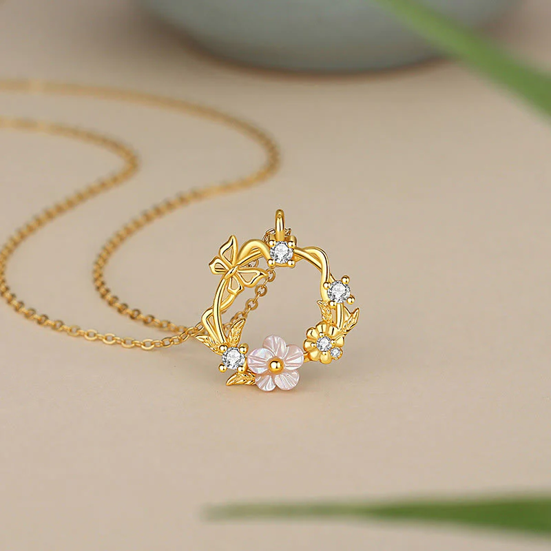 Sterling Silver Butterfly Shell Pendant Necklace showcases a round pendant made of 925 sterling silver, cubic zirconia, and shell components. The pendant stands for harmony and equilibrium, with the delicate butterfly and flower design signifying blessings and new beginnings. This necklace serves as a reminder of change and beauty, merging elegance with meaningful symbolism for spiritual wellness and good luck.