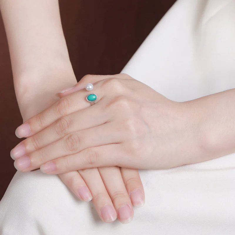 Enhance tranquility and gain deeper insights with this pearl and turquoise healing set that includes a necklace pendant, ring, and earrings. Combining the calming essence of pearls with the wisdom - bringing properties of turquoise, this 925 sterling silver collection is crafted to promote healing, offer protection, and boost intuition. It's perfect for those aiming to strengthen their bond with themselves and the surrounding world.