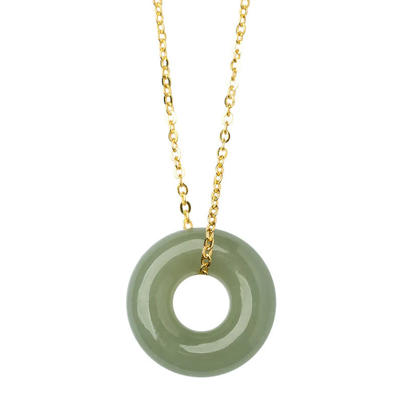 Jade Peace Buckle Necklace made of 925 sterling silver comes with a gold-plated peace buckle pendant. A round jade piece, representing unity and protection, is held by a smooth silver frame. The combination of jade and gold brings a sense of warmth and tranquility, making this necklace a meaningful item that embodies balance, harmony, and inner peace.