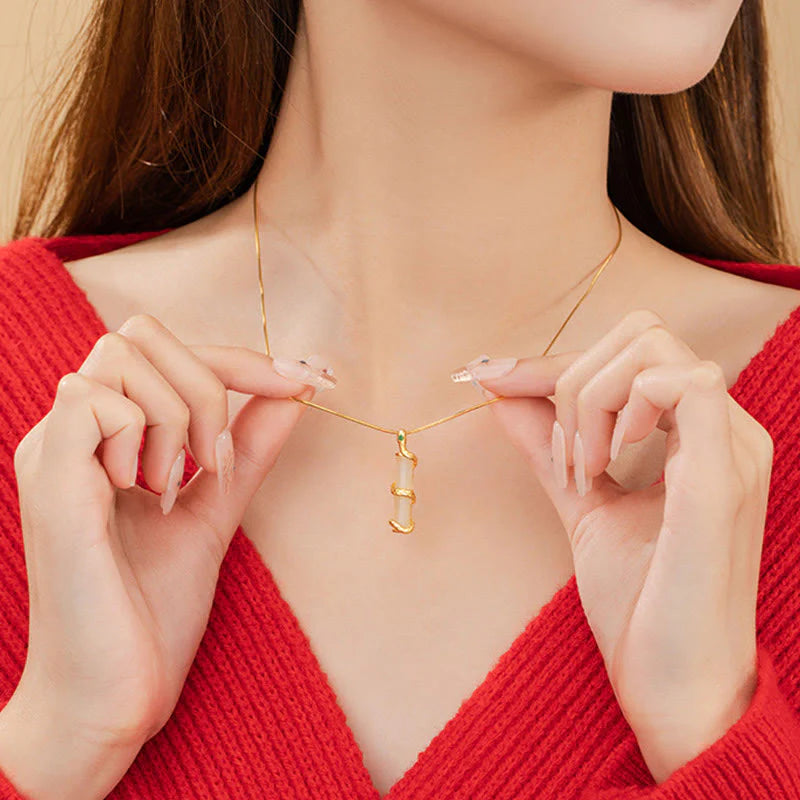 Silver Snake Bamboo Necklace Pendant showcases a snake delicately coiled around bamboo made of Hetian jade. The snake is a symbol of transformation and resilience, while the bamboo stands for growth and strength. Crafted from 925 sterling silver, this pendant combines natural allure and spiritual meaning. The combination of jade and silver creates a sense of harmony, serving as a powerful reminder of renewal and positive growth.