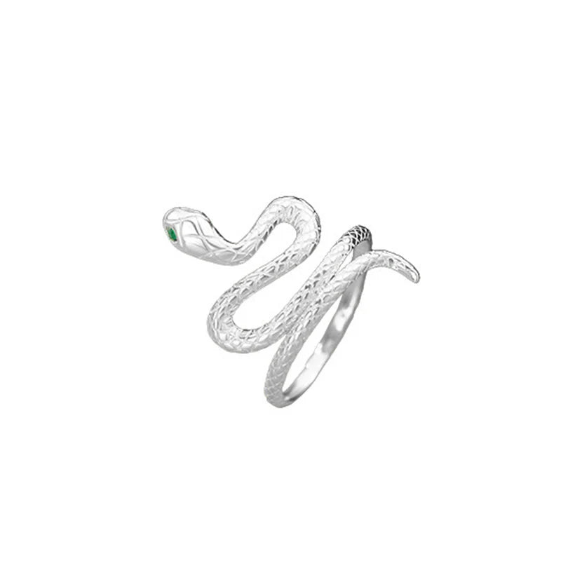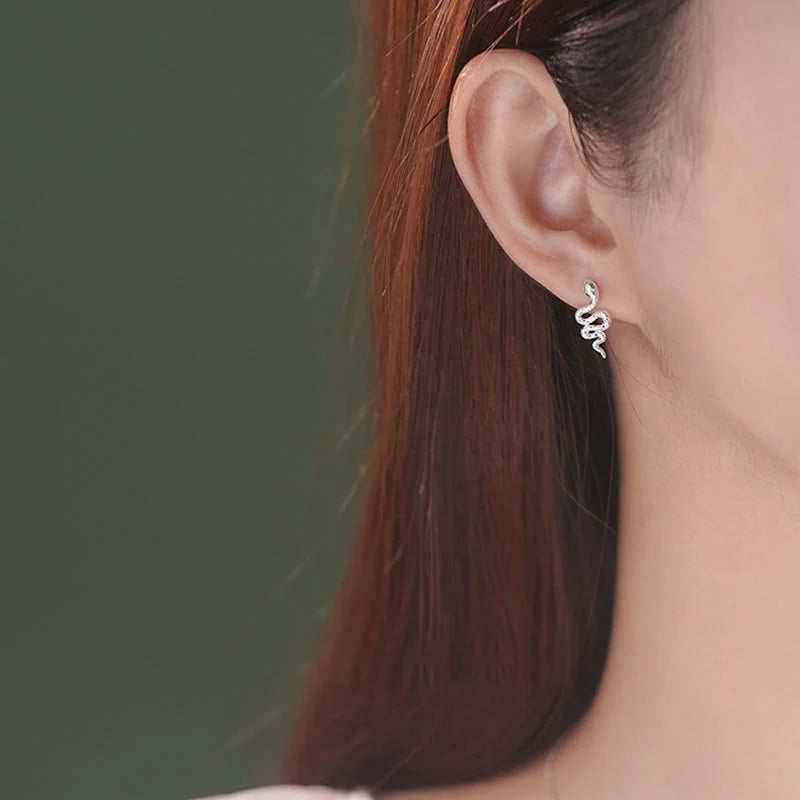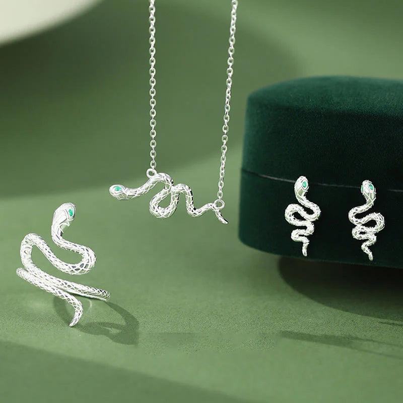 Snake-themed Jewelry Set showcases a peaceful snake design made of 925 sterling silver, representing tranquility and change. This set consists of a necklace pendant, a ring, and a pair of earrings, each embodying the strength and adaptability of the snake. Designed to bring balance and harmony, this meaningful set is an ideal symbol of personal development and resilience, blending elegance with spiritual value.