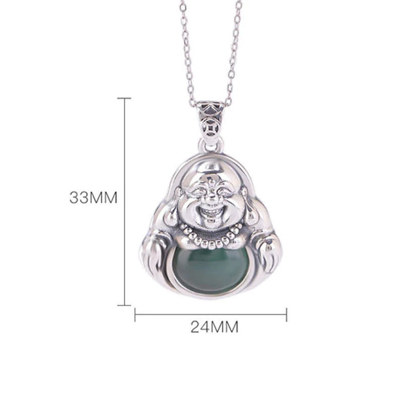 Laughing Buddha Cyan Jade Necklace Pendant is crafted from 999 sterling silver, with a beautiful Cyan Jade inlay on the Buddha's belly. The back of the pendant is engraved with a lotus flower, representing harmony and spiritual development. This pendant symbolizes joy, prosperity, and good luck, making it a perfect amulet for those pursuing success and inner peace.