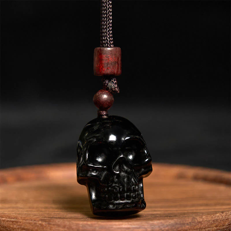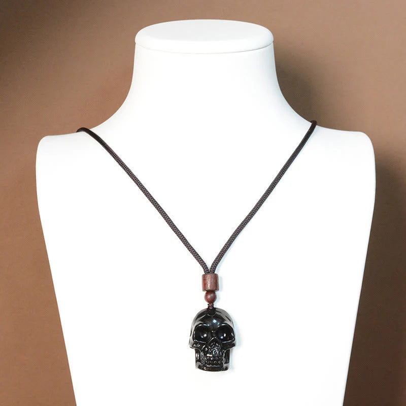 Black Obsidian Skeleton Pendant Necklace showcases a meticulously carved skeleton pendant crafted from black obsidian, representing fulfillment and change. The black obsidian stone has the ability to absorb negative energy, promoting clarity and resilience. This significant necklace serves as a memento of life's cycles, providing stabilizing energy and spiritual safeguard to the wearer while aiding personal development and self-actualization.