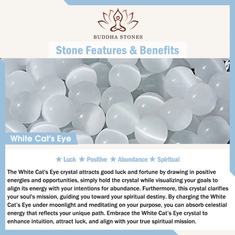 The White Cat's Eye crystal attracts good luck and fortune by gathering positive energies and opportunities. Hold the crystal while visualizing your goals to align its energy with your desires for abundance. It also clarifies your spiritual mission and guides you towards your spiritual path. Charging it under moonlight and meditating on your purpose can help you absorb celestial energy.