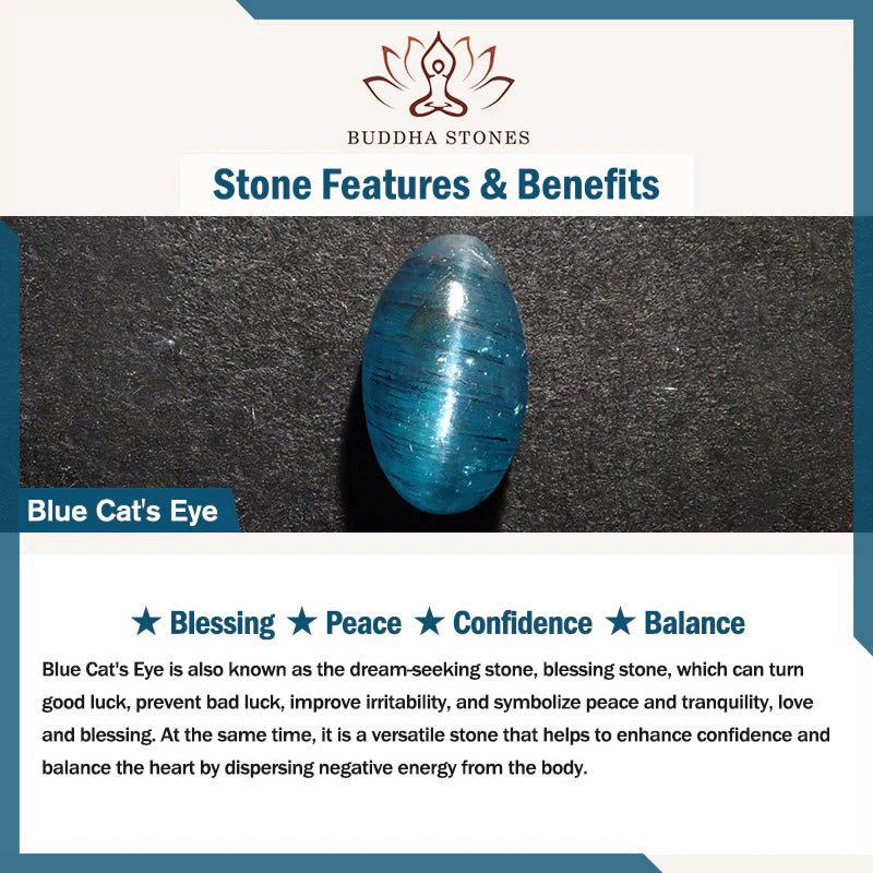 Blue Cat's Eye, also known as a lucky and peaceful stone, can bring good luck, ward off bad luck, and improve irritability. It symbolizes peace, love, and blessings. It helps enhance confidence and balance the mind by expelling negative energy from the body.