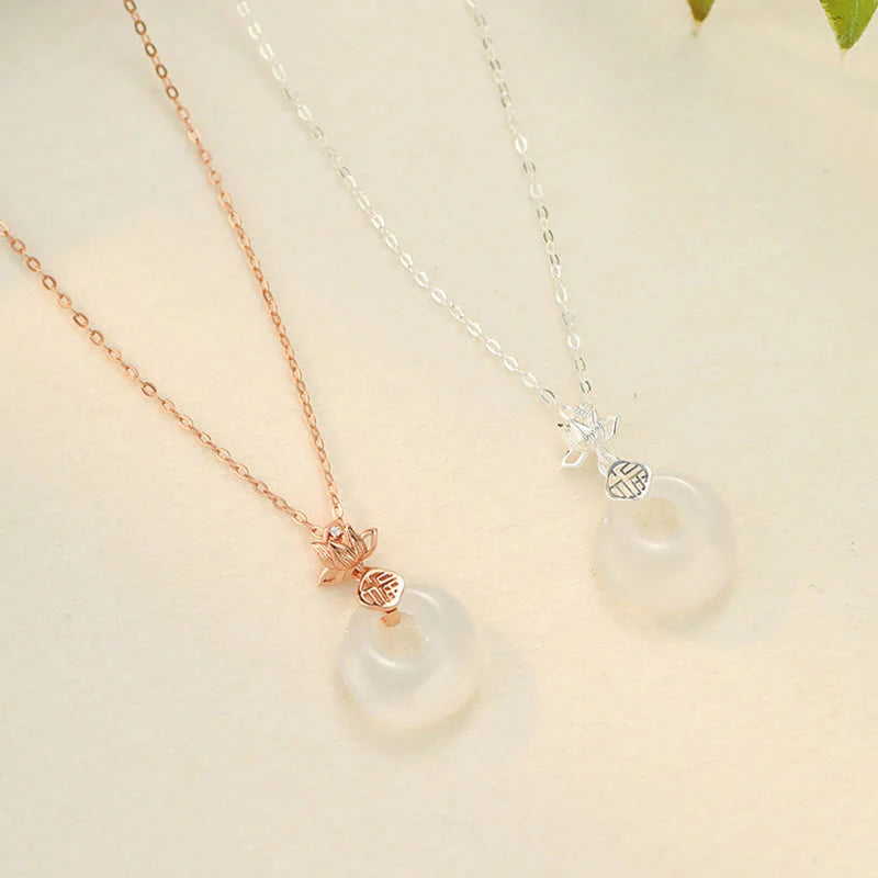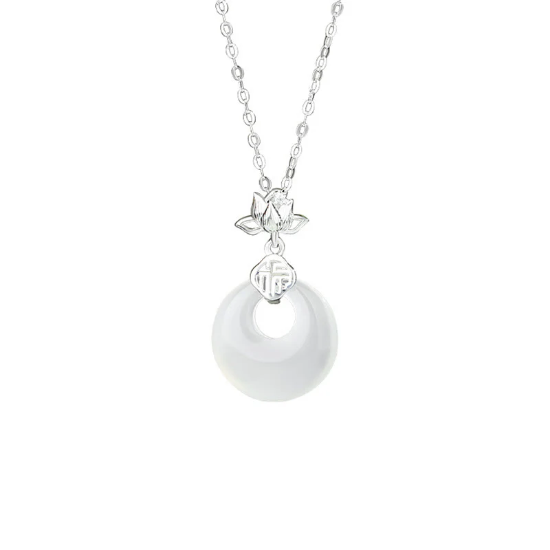 Chalcedony Peace Buckle Necklace Pendant combines a chalcedony peace buckle with lotus flower and Fu character ornaments. It symbolizes tranquility and good luck. Made of 925 sterling silver, it is both durable and elegant. The lotus flower stands for purity, while the Fu character represents good fortune. This meaningful pendant encourages harmony, making it a great gift or a precious symbol of peace.