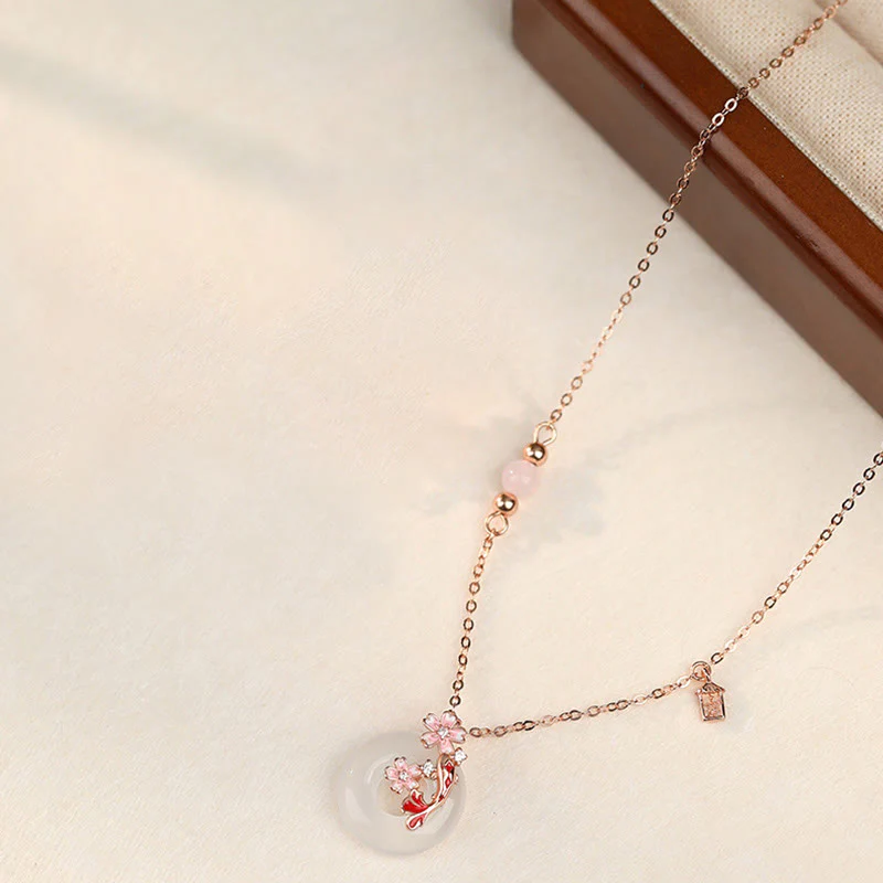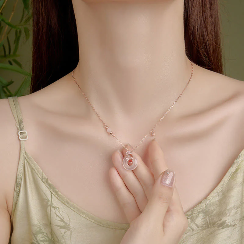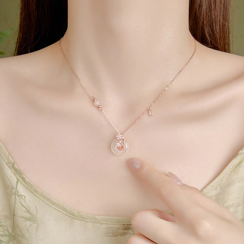 Chalcedony Sterling Silver Necklace Pendant features a chalcedony peace buckle decorated with delicate flowers and koi fish, symbolizing harmony and prosperity. Two pink crystals are on the chain, inspiring love and emotional balance. Made of 925 sterling silver, this pendant combines durability with a meaningful design. The koi fish stands for good fortune, and the peace buckle promotes serenity, making it a cherished symbol of mindfulness.