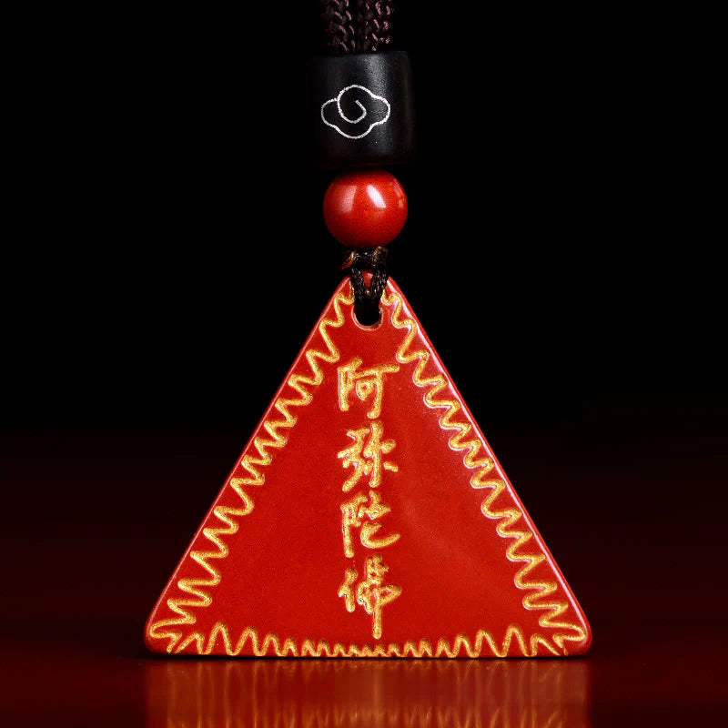 Cinnabar Amitabha Necklace Pendant comes with a red triangular pendant inscribed with a special word and topped with a cinnabar bead. The triangle represents balance and spiritual harmony, and the inscribed word brings peace and tranquility. Cinnabar is thought to provide vitality and protection. This pendant is designed to help with inner calm and spiritual health.