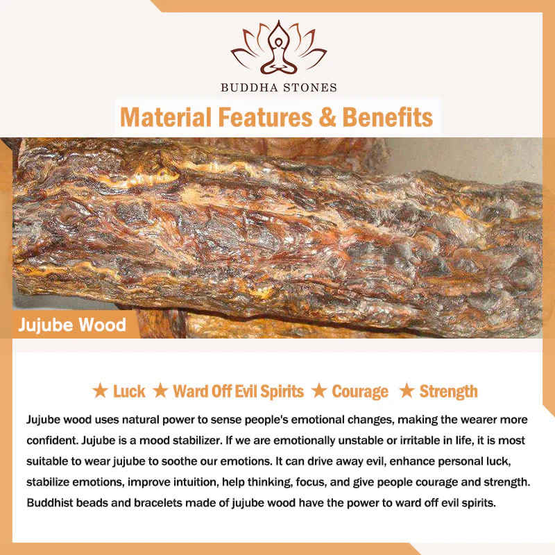 Jujube wood can sense emotional changes, boosting the wearer's confidence. It acts as an emotional stabilizer. When one is emotionally unstable or irritable, wearing jujube wood can soothe emotions. It can drive away evil, enhance personal luck, stabilize emotions, improve intuition, aid thinking, and give courage and strength. Items made of jujube wood are believed to have the power to ward off evil spirits.