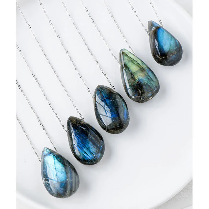 PS: The lights on the labradorite are caused by internal fractures that reflect light back and forth, scattering it into various colors. So, the color shown on each rough stone pendant will not be exactly identical.