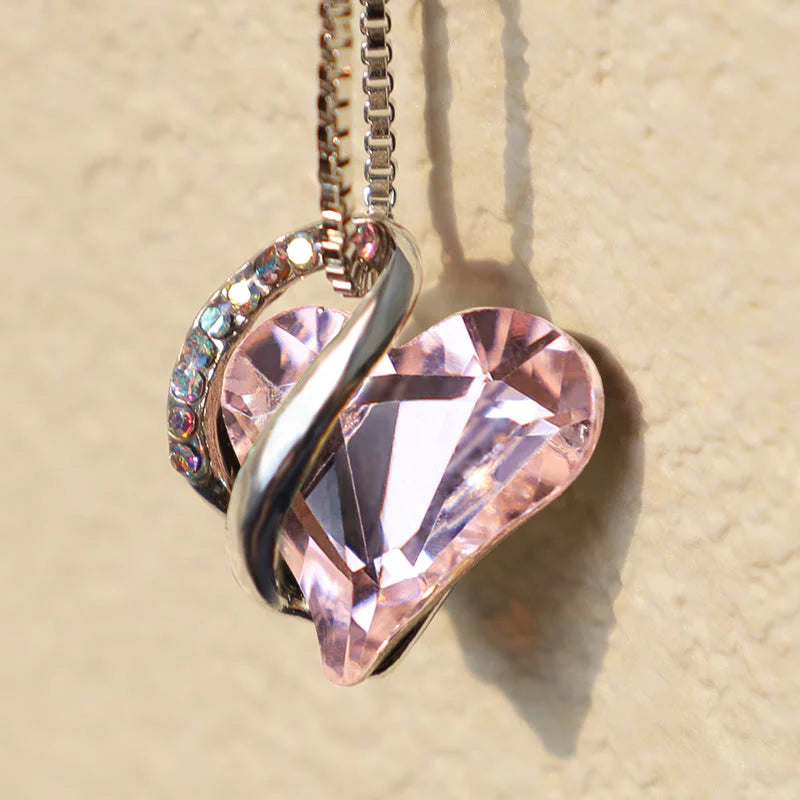 This stunning love pendant showcases a heart - shaped high - quality birthstone crystal, adorned with a silver - like and shiny ribbon, forming a complex structure resembling an infinity symbol. It takes us through the dimensions of time and space, the richness of life, and finally the victory of love.