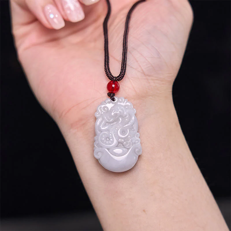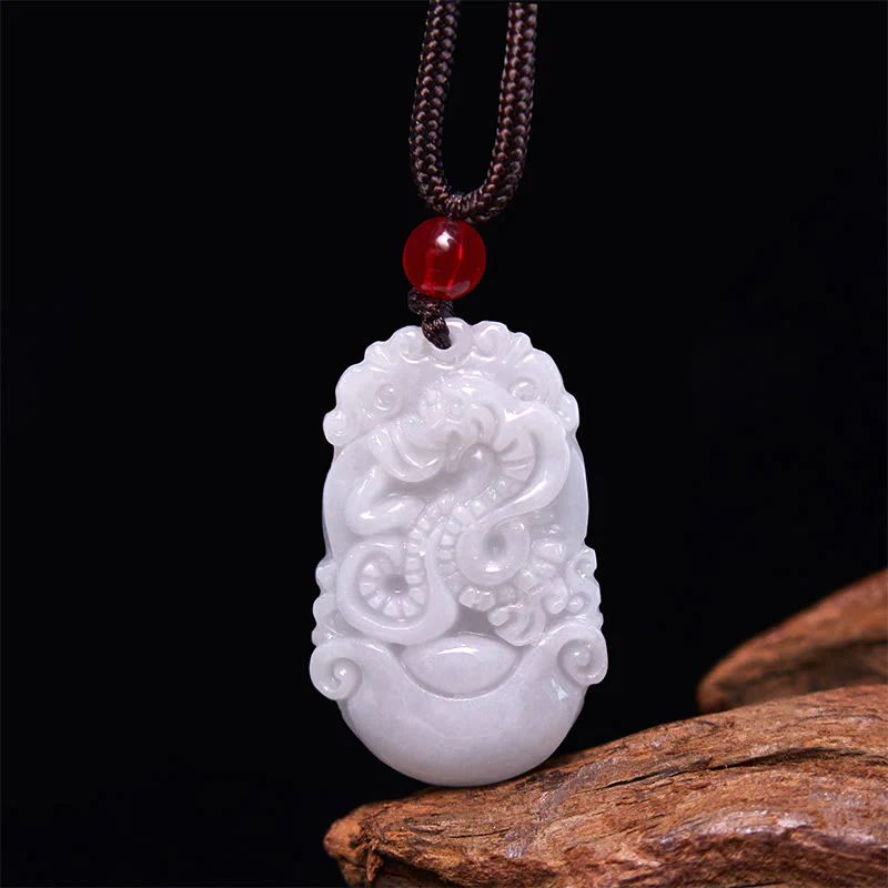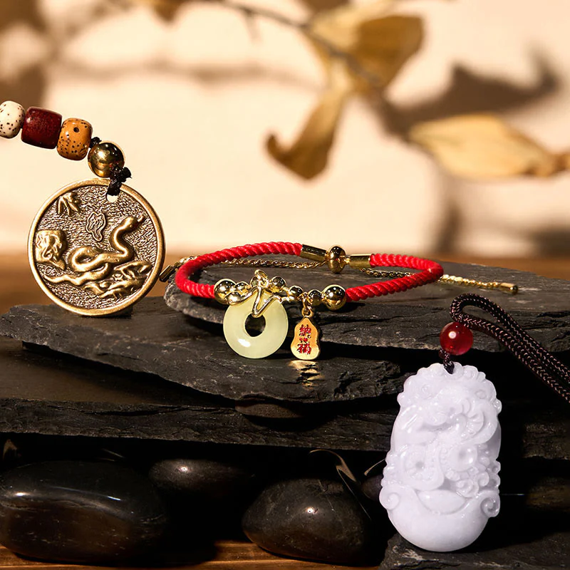 Jade Red String Snake Set includes a keychain with a carved snake design, a red string bracelet featuring a jade peace buckle with a snake pattern, and a jade pendant necklace engraved with a snake. These items are designed to provide protection and spiritual strength, especially for those born in the Year of the Snake. Meticulously crafted, they symbolize good fortune and balance.