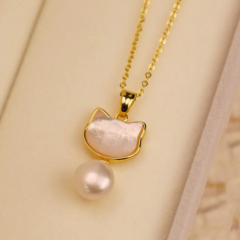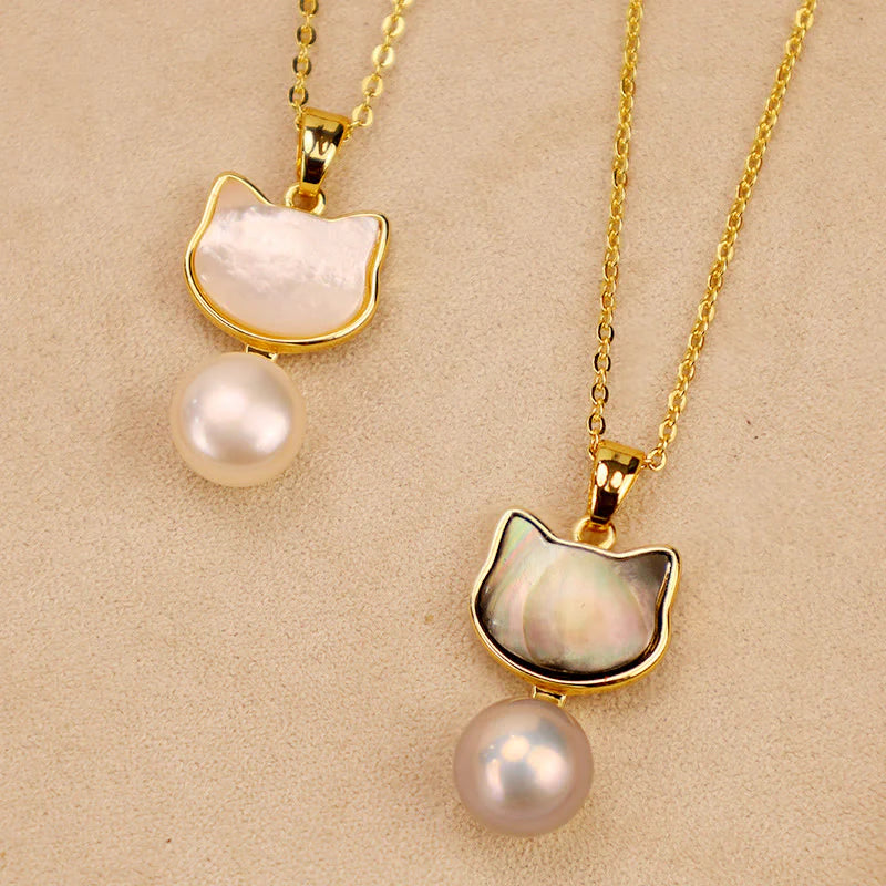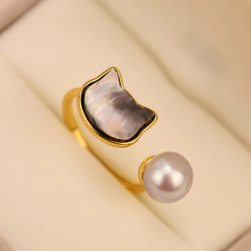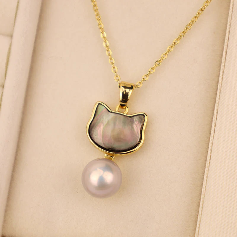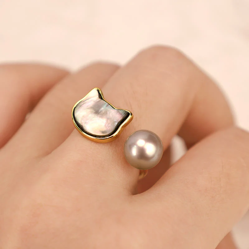 The cat design is paired with grey pearls. These grey pearls are white natural pearls treated with a special process and won't fade.
