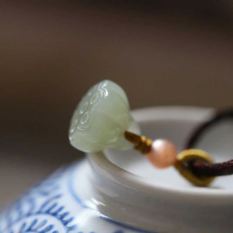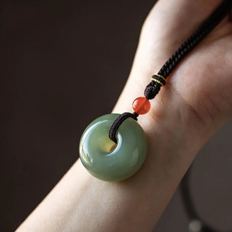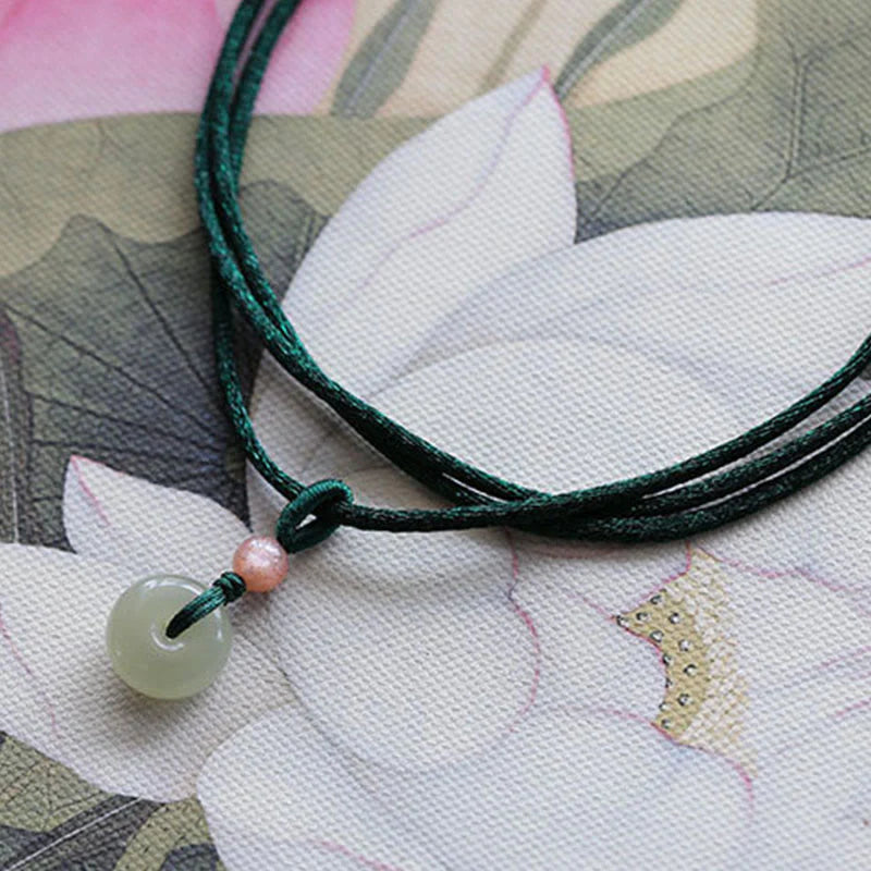 Explore the blend of symbolism and style with this natural round jade peace buckle lotus abundance string necklace pendant. Crafted from real jade, this pendant features a harmonious combination of the peace buckle and lotus symbols, representing inner peace and abundance. Enhance your energy while wearing this meaningful and elegant piece.