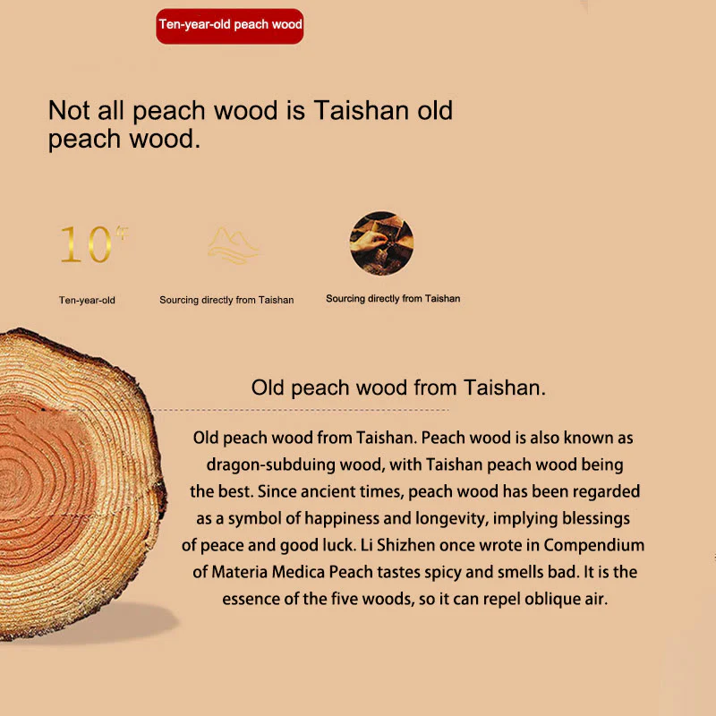 In ancient times, it was believed that the northeast was the entrance for evil spirits. So, two guardians were in charge of this area to stop evil from entering the human world. They were protected by a huge peach tree. Whenever they saw a ghost trying to enter, they would tie it up and throw it into a forest for tigers to eat. Since then, people would hang peach - wood panels on their doors to drive away evil. Thus, in traditional culture, peach wood is thought to bring luck, ward off evil, and attract wealth.