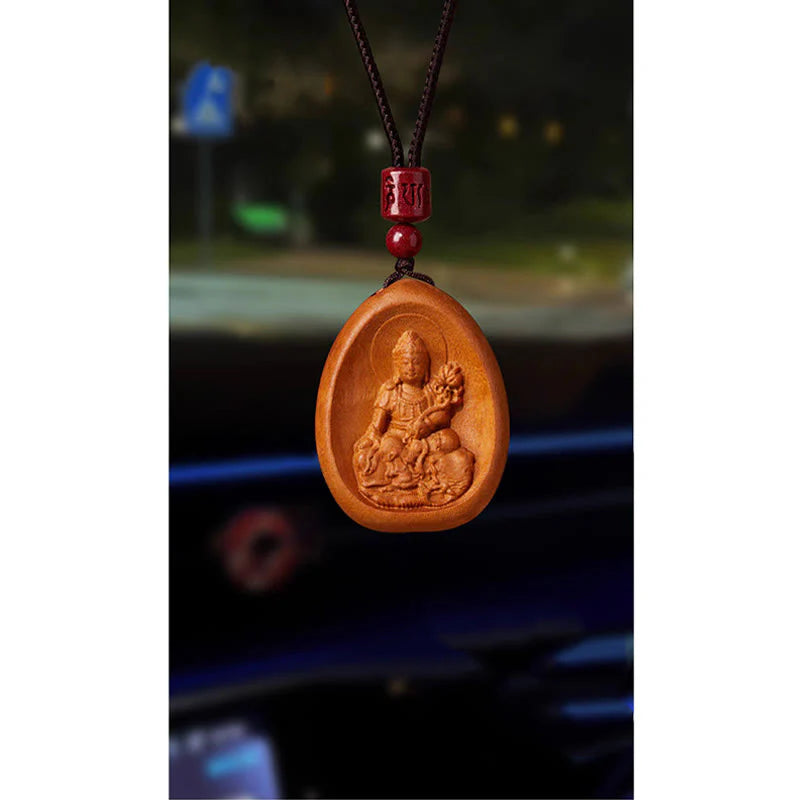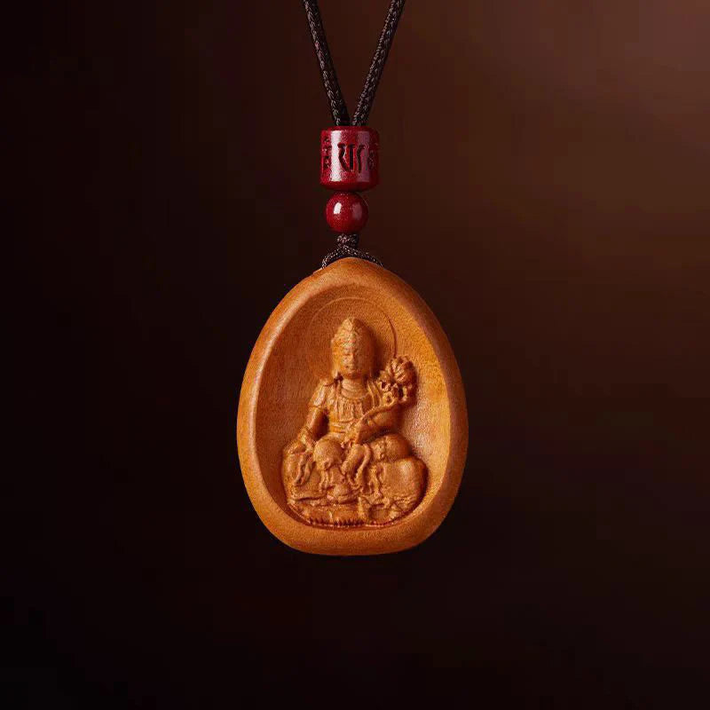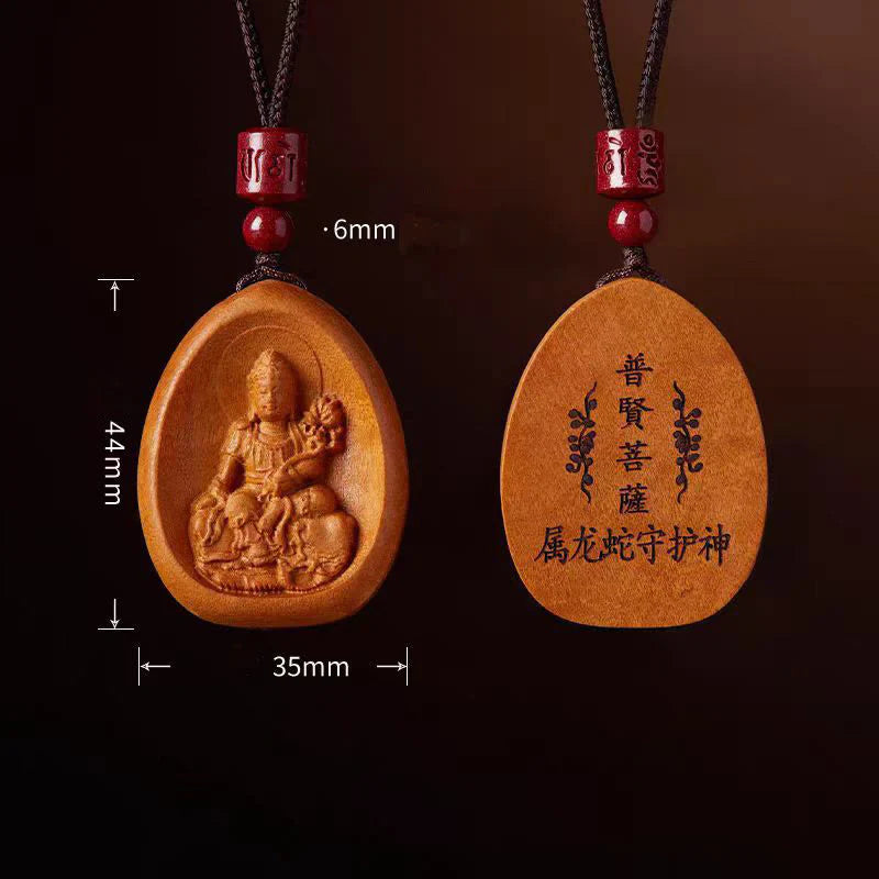 Chinese Zodiac Necklace Pendant Made of Peach Wood and Cinnabar features a carved peach wood pendant with a corresponding Chinese zodiac symbol. The pendant includes a cinnabar cylinder engraved with \"Om Mani Padme Hum\" and a cinnabar bead, representing spiritual growth, protection, and balance. This item is designed to bring positive energy, peace, and spiritual guidance to the wearer.