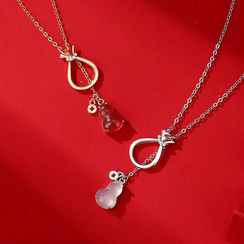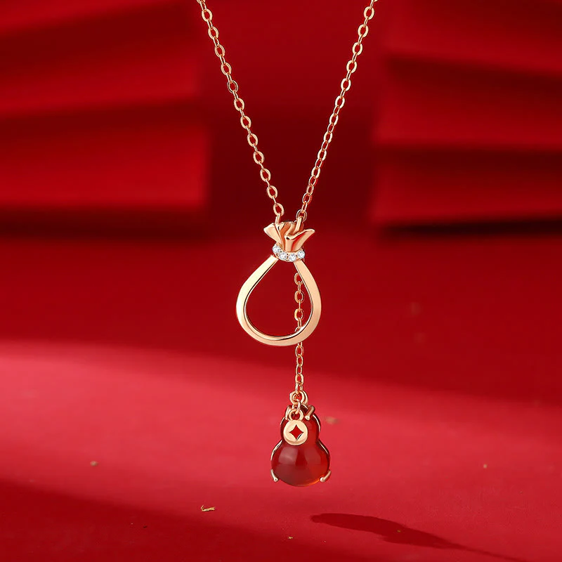 Red Agate or Chalcedony Gourd Necklace Pendant comes with a gourd-shaped pendant crafted from either red agate or chalcedony. It represents abundance and good luck. The lucky bag charm offers additional protection and prosperity. This blend of materials and symbolism is intended to boost confidence and bring luck to the wearer, providing both spiritual and aesthetic advantages.