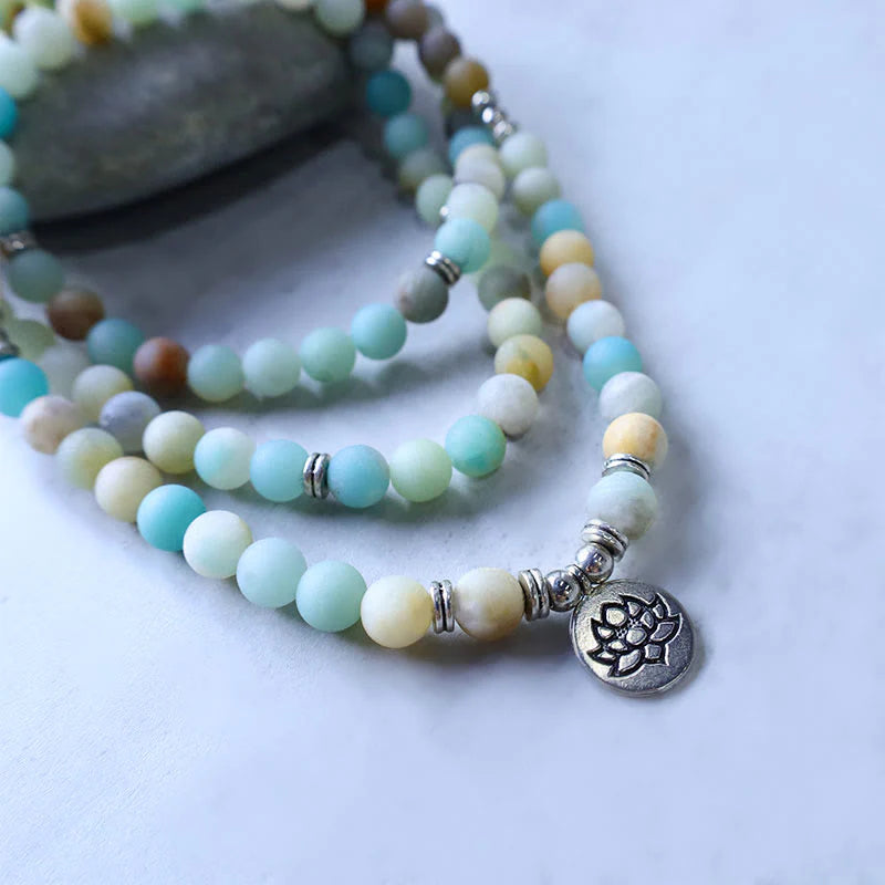 Discover this beautiful prayer beads crafted from Amazonite stones. Amazonite is well - known for its calming and soothing qualities. Handmade in the traditional Tibetan style, the lotus - themed design symbolizes purity and enlightenment. Enhance your meditation experience with this significant item.