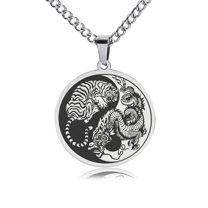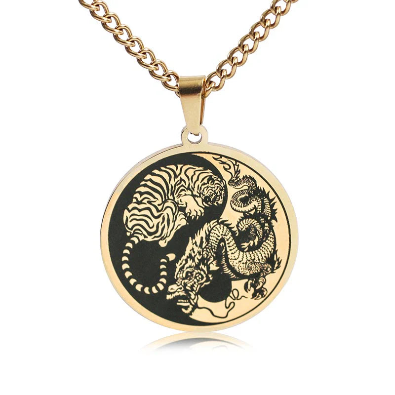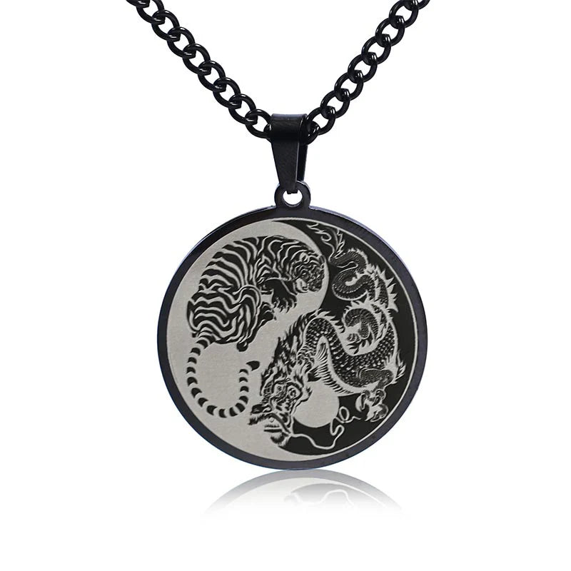 A sleek titanium steel chain necklace features a tiger dragon pendant. This unique pendant, with its harmony - inspired design, represents balance and unity. Crafted from high - quality materials, it's both long - lasting and stylish. Wear it as a symbol of strength and harmony. Purchase yours now and feel the charm of the pendant and the elegance of the titanium steel chain necklace.