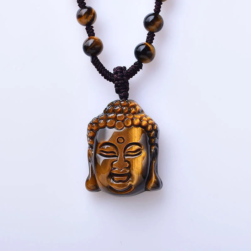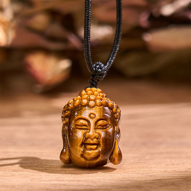 Tiger Eye Buddha Head Pendant Necklace showcases a Buddha head pendant crafted from tiger eye stone. This stone is known to symbolize courage, wisdom, and inner peace. Tiger eye stone emits grounding energy, offering emotional strength and stability. Wearing this necklace can serve as a spiritual reminder to face life's challenges with courage, helping the wearer stay balanced and resilient in tough situations.