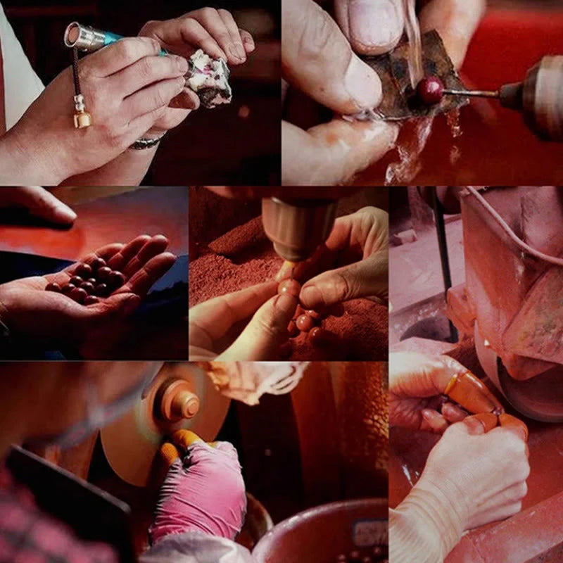 In Buddhist traditions, cinnabar is often made into prayer items. It can soothe the mind, help with concentration, and enhance wisdom. It's an important amulet for those who follow Buddhism.
